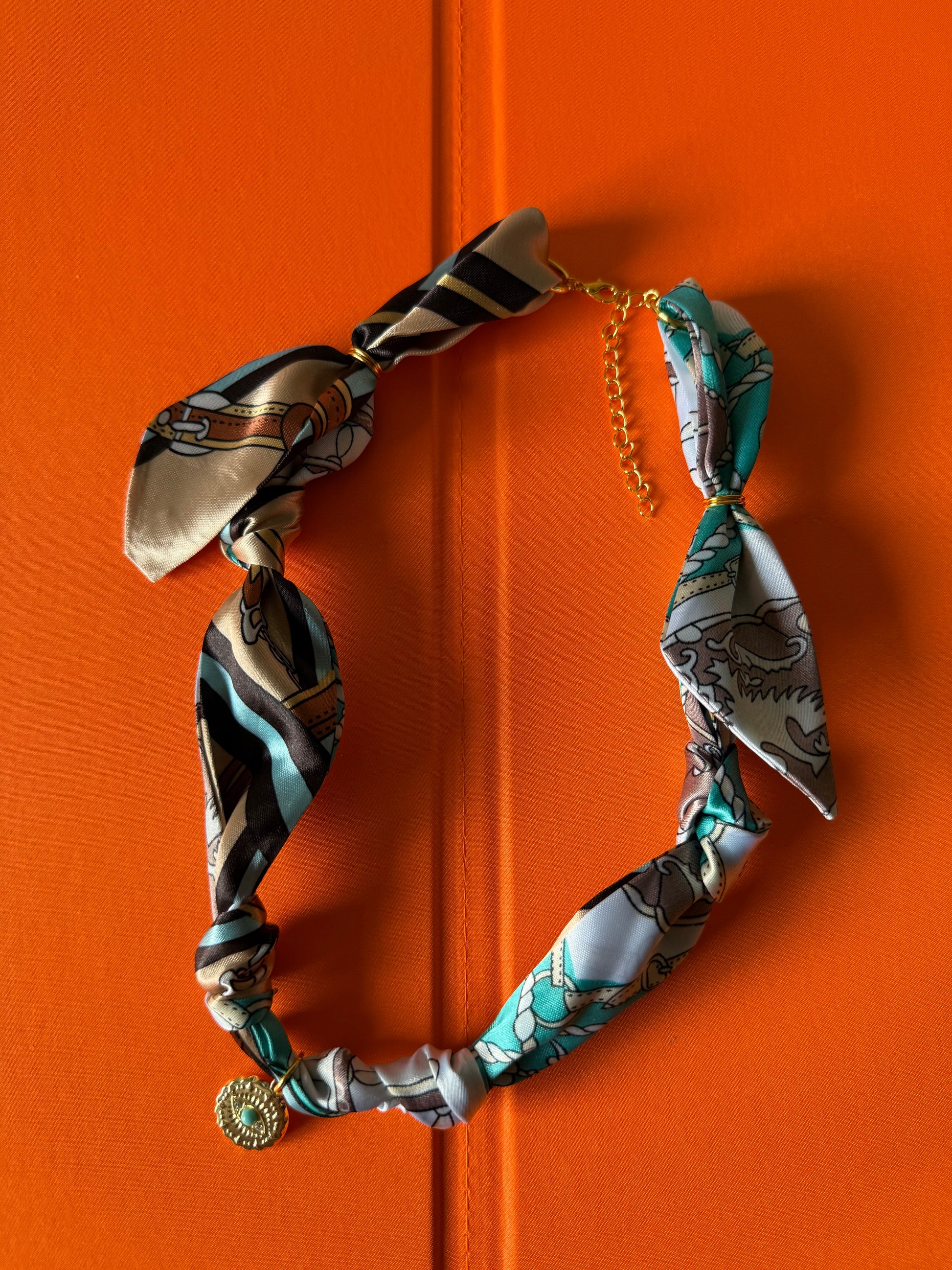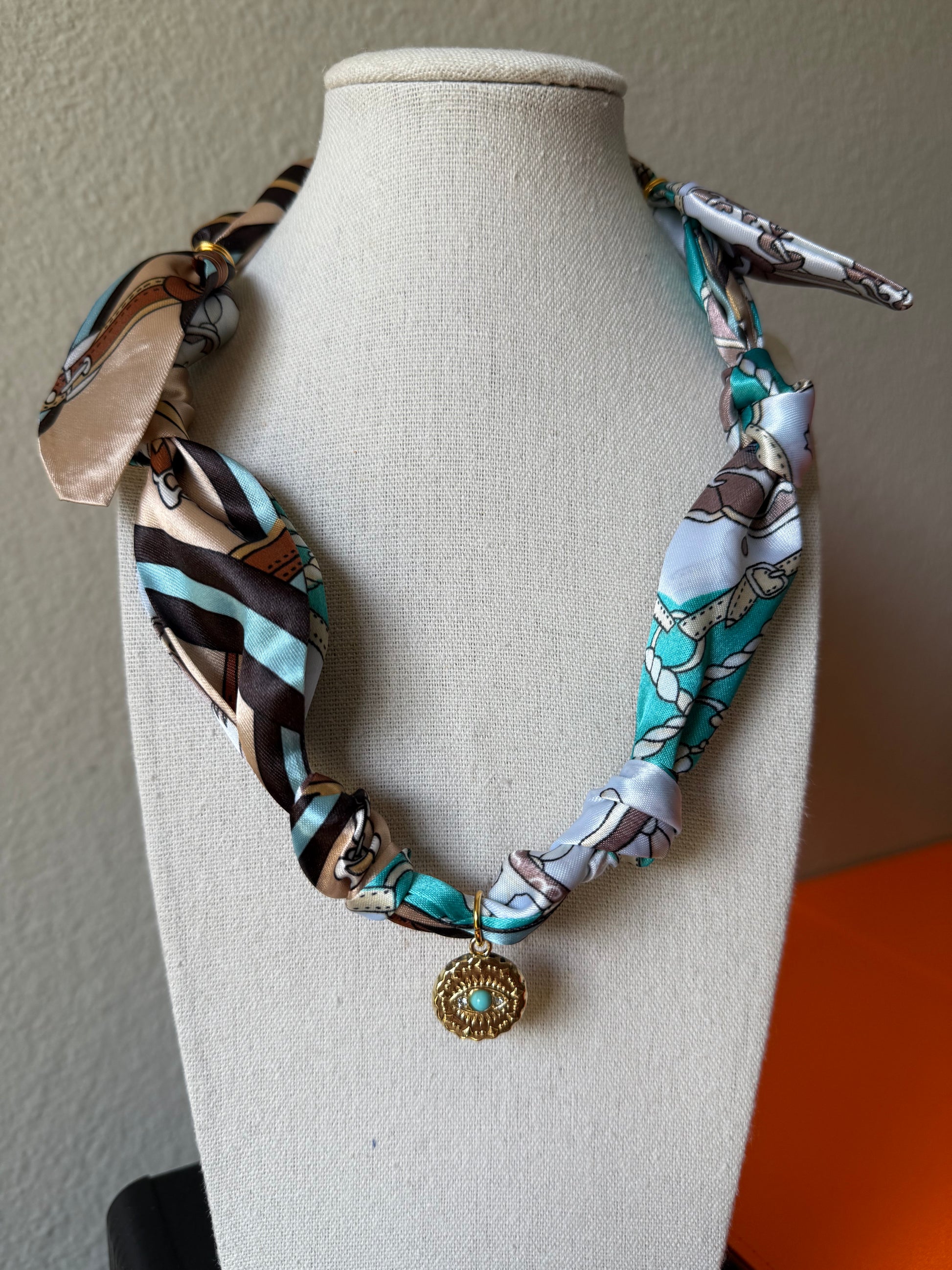 Tan/Brown/Turquoise twillies with gold findings & gold Evil Eye coin with turquoise accent. 19" plus extender.