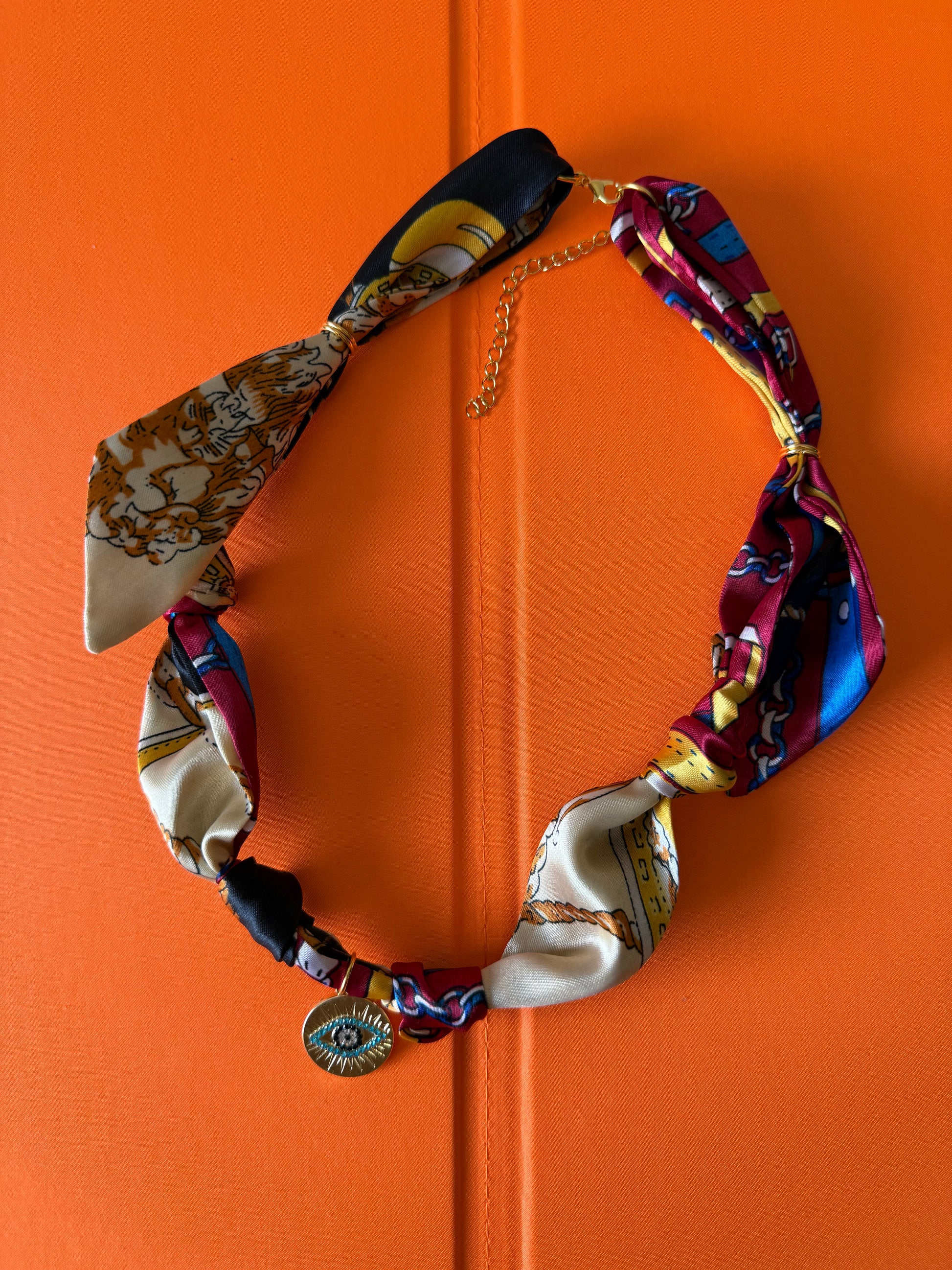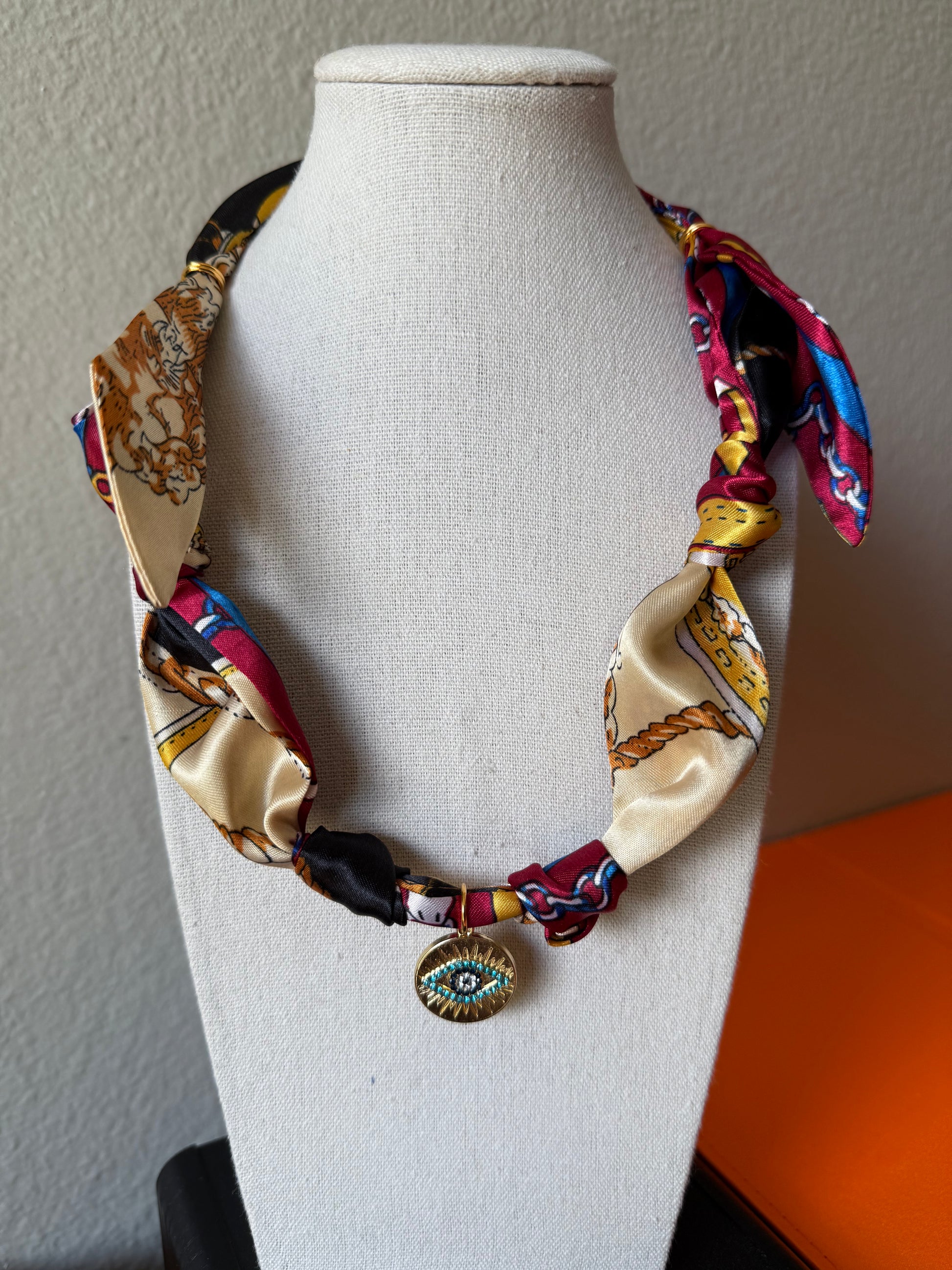 Multicolor twillies with gold findings & gold/rhinestone Evil Eye pendant. 19" plus extender.