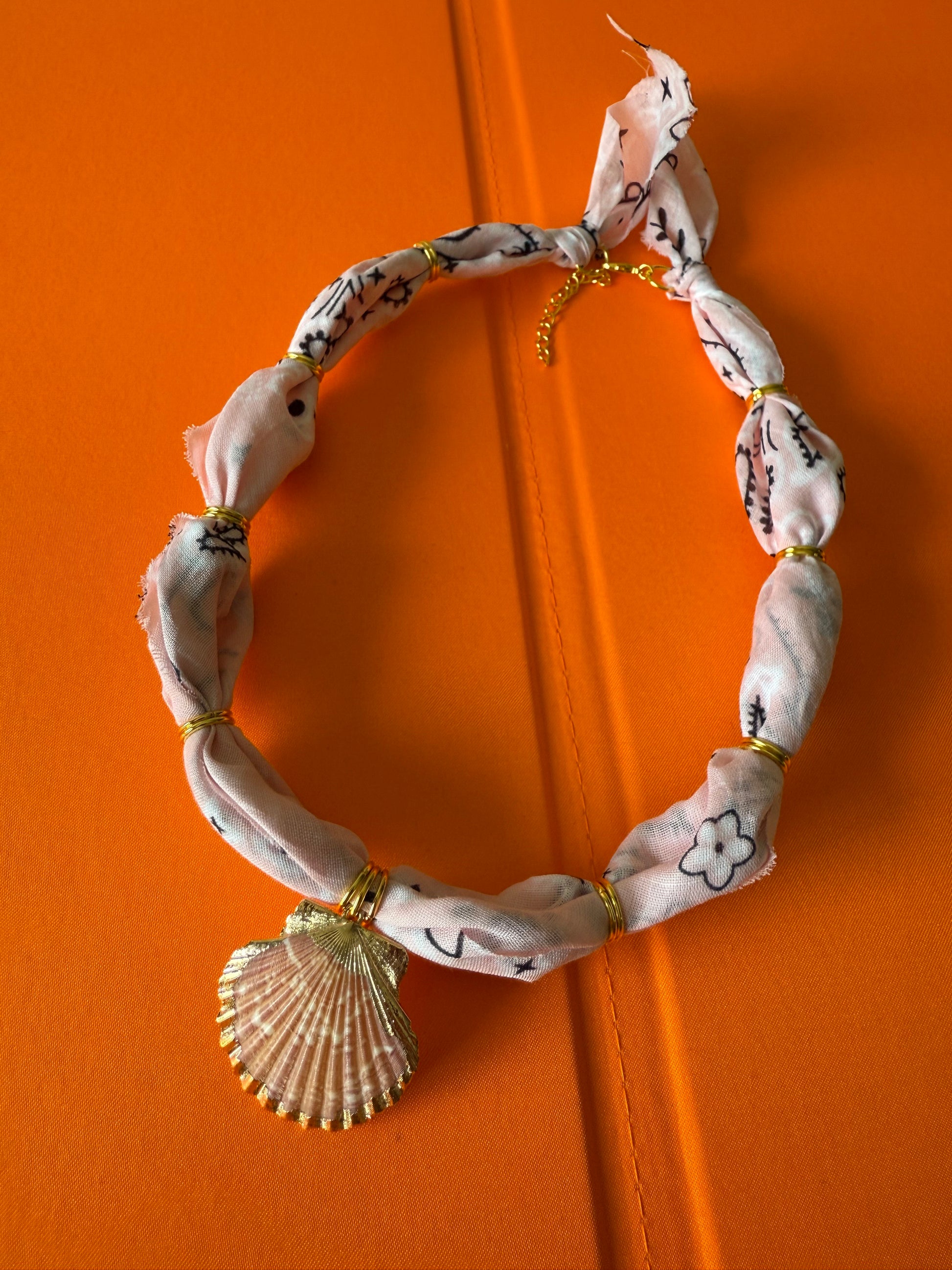 Light Pink bandana with gold findings & natural, gold-dipped pink Clam Shell pendant. Approx. 17-18" plus extender.