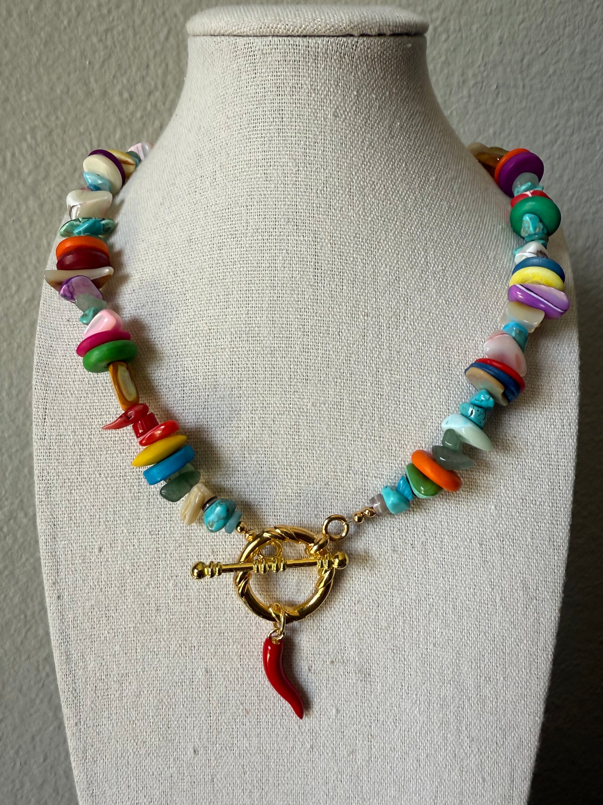 Each Sorrento necklace is handmade & made to order. Colors may vary slightly. Made of varying glass, bone, stone, and shell beads. Available with Red or Gold Italian Horn pendant.