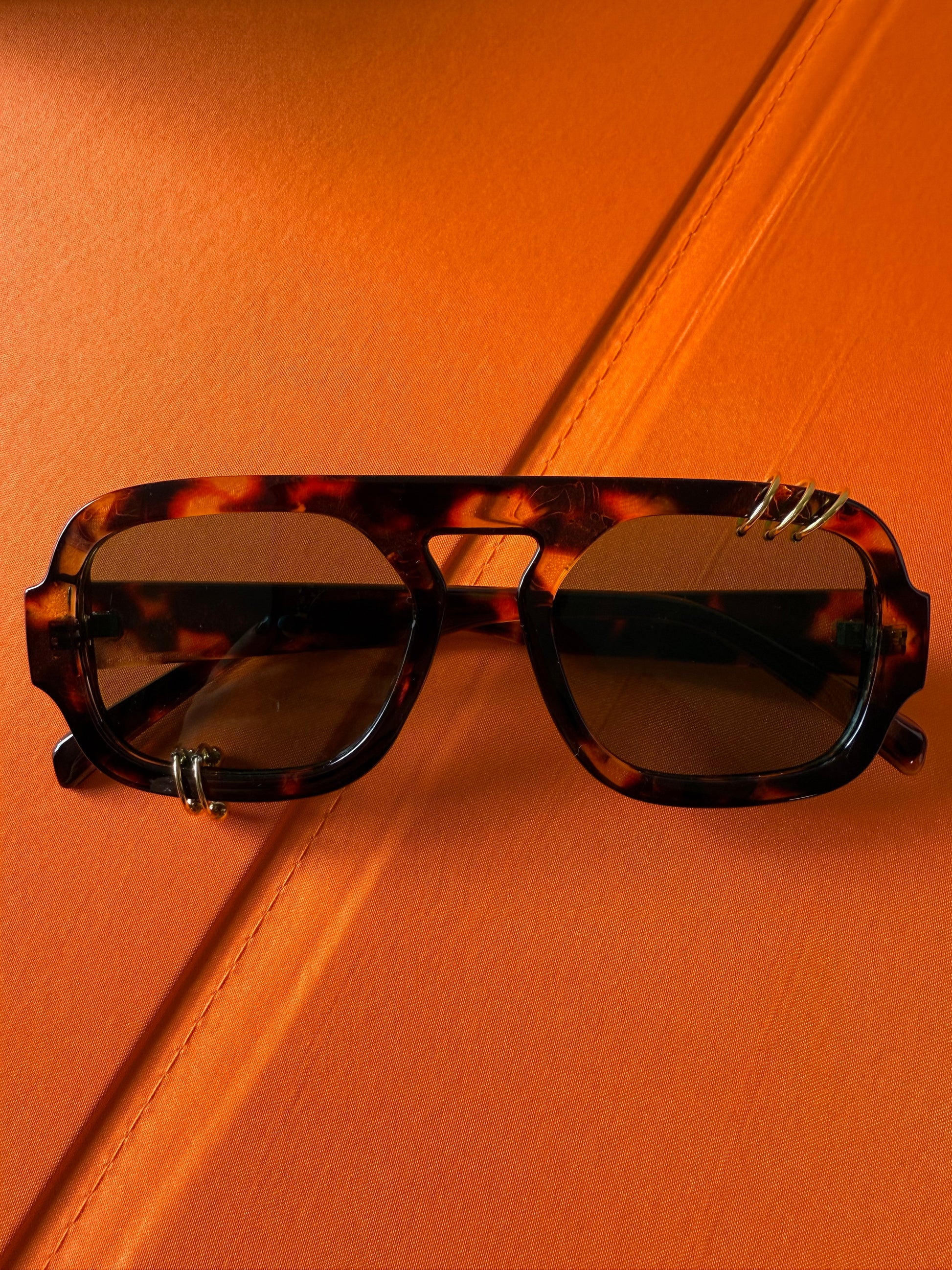 Tortoise Aviator style frames with green lenses, and gold rings.